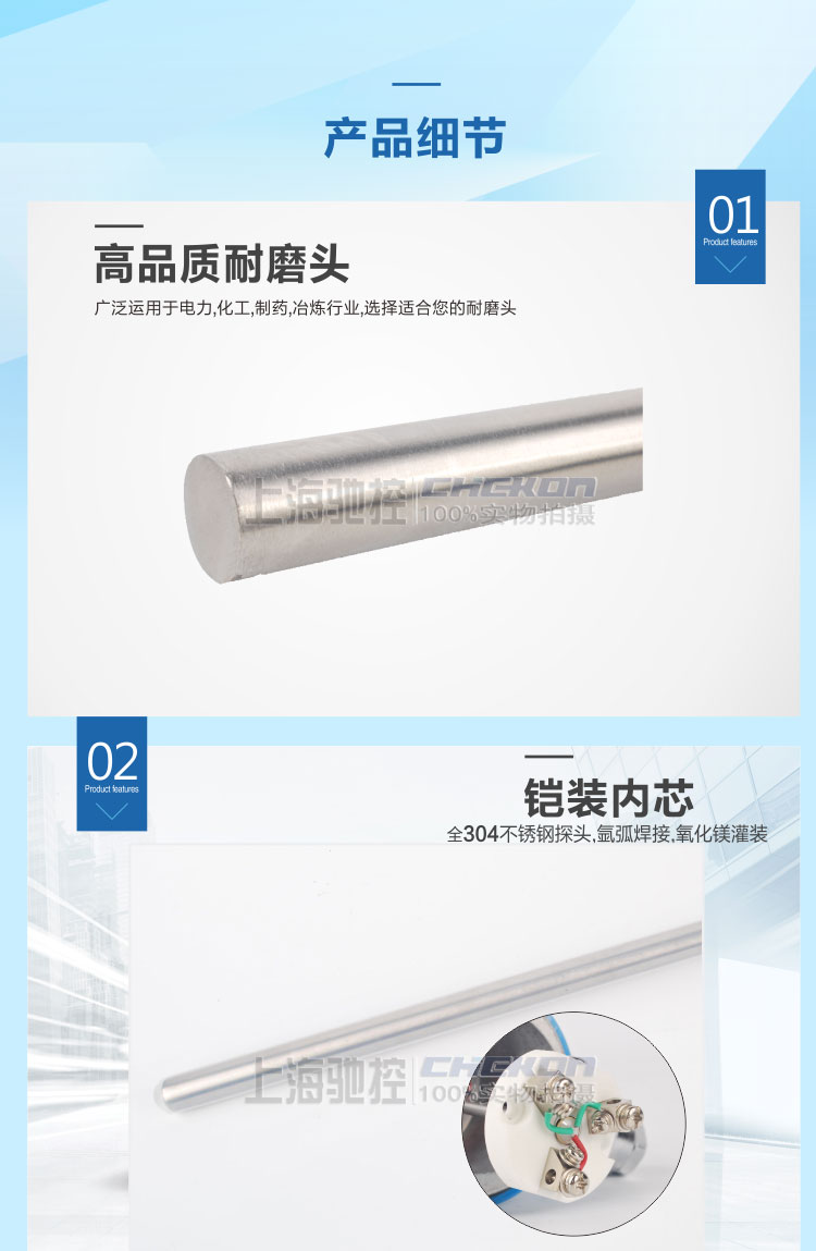 耐磨热电阻和耐磨热电偶一样都是电厂循环流化订锅炉,沸腾锅炉,粉磨煤机造气炉和水泥厂系列窑头,窑尾,炉头罩及化工,冶炼等高温耐磨环境较为理想的高技术类专用产品,耐磨热电阻博采众长,采用独特的工艺配方,在失态平衡中制作出耐磨合金该产品与普通不锈钢金属,金属陶瓷保护管,与市场上同类耐磨合金保护管相比,其使用寿命提高1-5倍.由于环境温度差,温控点过高,振动较大,鼓风机风速过高,磨损严重,造成温度测量非常困难,使用寿命很短暂,一般的耐磨合金只有10-90天就磨透损坏,烧弯,折断,造成热电阻损坏,给用户带来很大的损失和不必要的麻烦,耐磨型热电偶弥补了这个缺点.